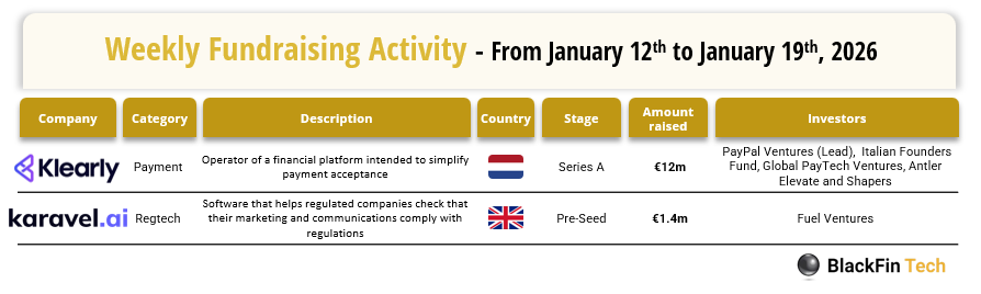 Over the last week, there were two fintech deals in Europe, raising a total of €13.4 million, including one transaction in Netherlands and one in the UK.