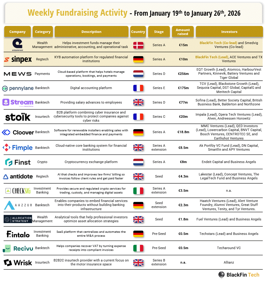 Over the last week, there were sixteen fintech deals in Europe, raising a total of €601.2 million, including four transactions in the UK, three in Germany, three in France, two in Italy, two in the Netherlands, and one each in Denmark and the Czech Republic.